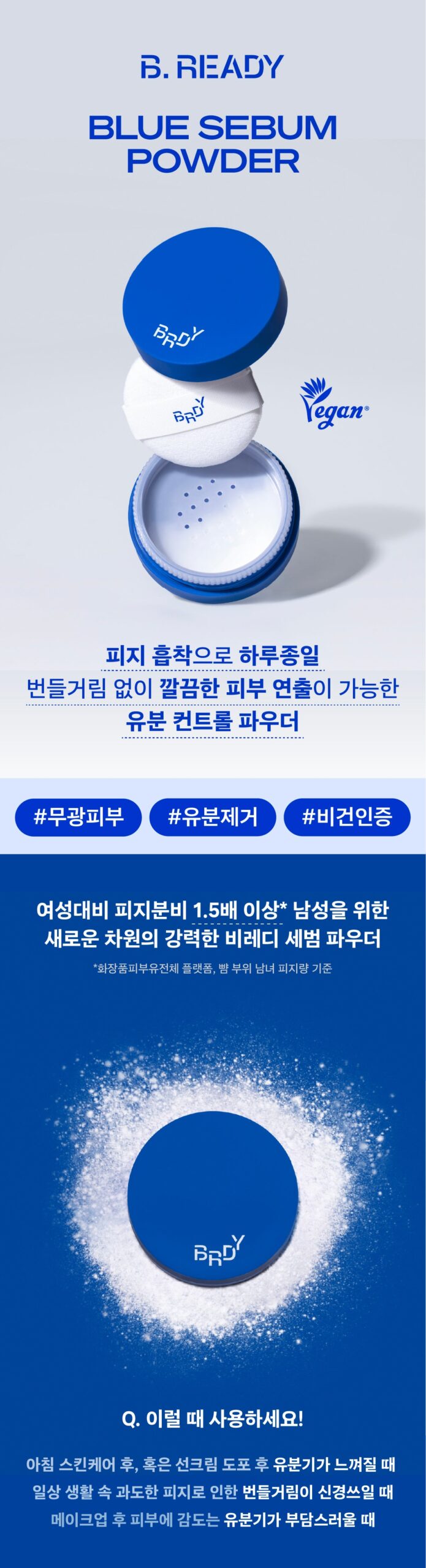 Achieve all-day shine control with the B.READY Blue Sebum Powder. Designed to absorb excess sebum and deliver a matte, clean finish, this vegan-certified powder is perfect for managing oil without compromising skin hydration.