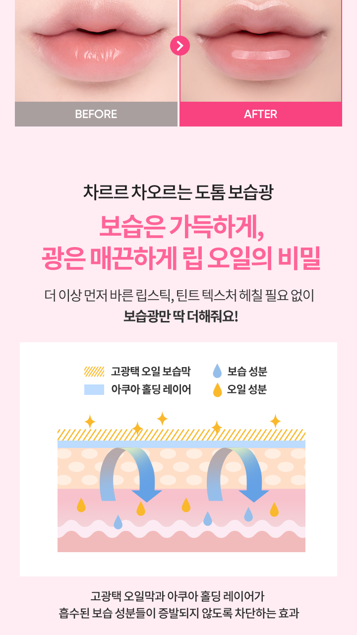 - High-Gloss Finish: Creates a glossy oil barrier with Aqua Holding Layers that help prevent the evaporation of absorbed moisture, keeping your lips hydrated and shiny.