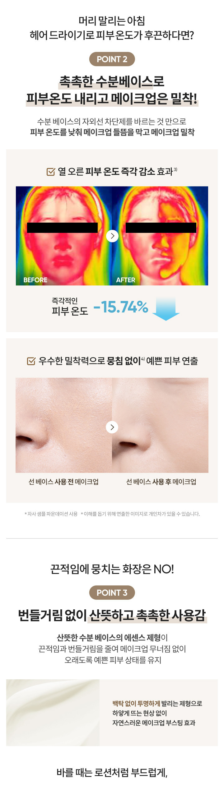 Applying a moisture-based UV protectant alone can lower skin temperature, preventing makeup from lifting and ensuring close adhesion. It instantly reduces skin temperature by 15.74% and creates a beautiful skin without clumping due to its excellent adhesion.