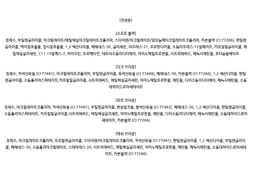 | Soft Black | Purified Water, Butylene Glycol, Acrylates/Ethylhexyl Acrylate Copolymer, Styrene/Acrylates/Ammonium Methacrylate Copolymer, Carbon Black (CI 77266), Pentylene Glycol, White Willow Bark Extract, Gardenia Extract, 1,2-Hexanediol, Beheneth-30, Glyceryl Caprylate, Laureth-21, Pentasodium Triphosphate, Caprylyl Glycol, Ethylhexylglycerin, C11-15 Pareth-7, Biotin, Tromethamine, Tetrasodium EDTA, Aminomethyl Propanol, Phenoxyethanol, Potassium Sorbate |