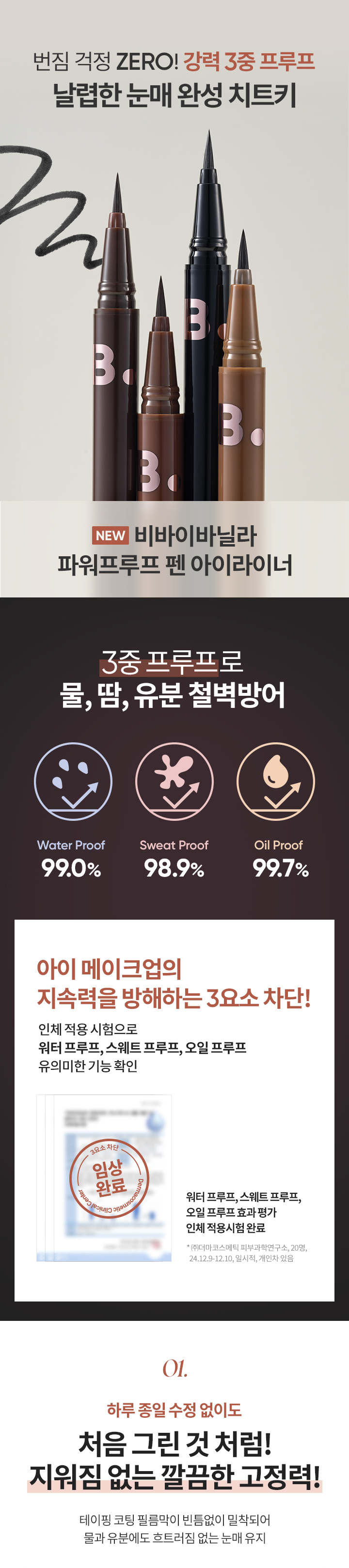 Significant functional verification of Water-Proof, Sweat-Proof, and Oil-Proof through human application tests. (Source: P&K Skin Clinical Research Center, 20 adult women, 2024.10.12~10.13, individual differences may exist.)