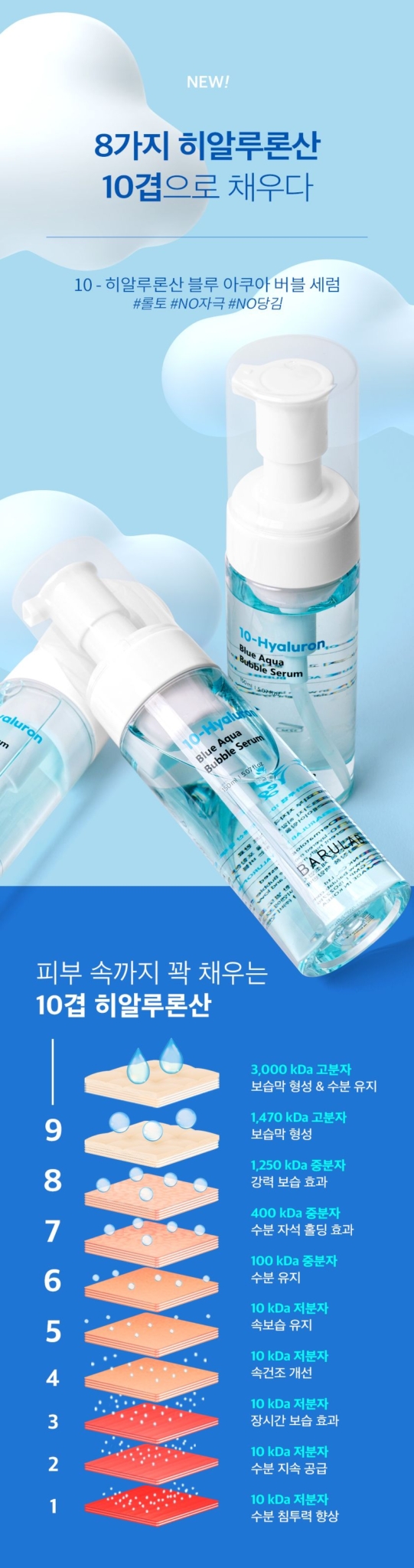 Hydrate intensively with BARULAB’s 10-Hyaluronic Acid Blue Aqua Bubble Serum. This innovative bubble serum delivers 10 types of hyaluronic acid for multi-layer hydration.