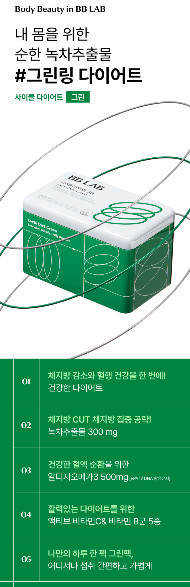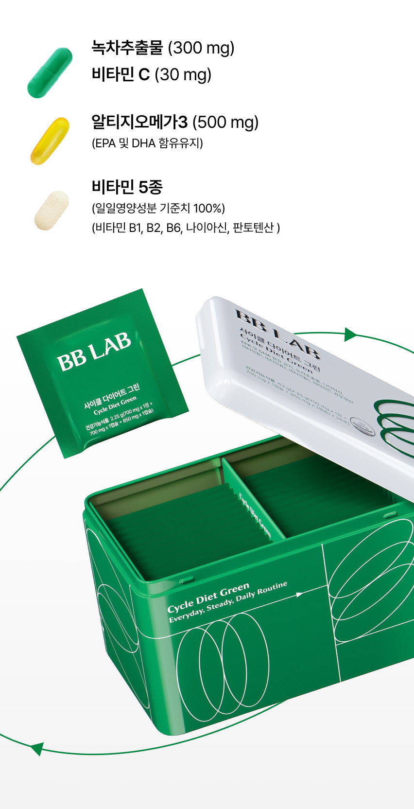 BB LAB Cycle Diet Green provides everyday steady diet support with its green formula. Each sachet contains a combination of supplements designed to support a healthy lifestyle with an everyday, steady daily routine approach.