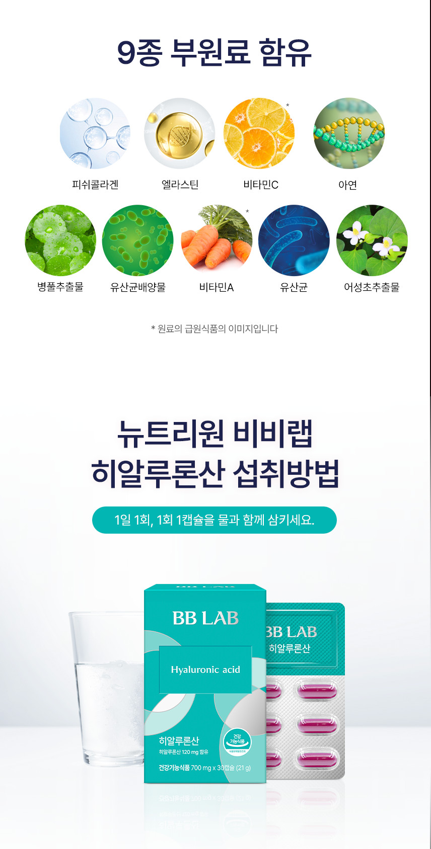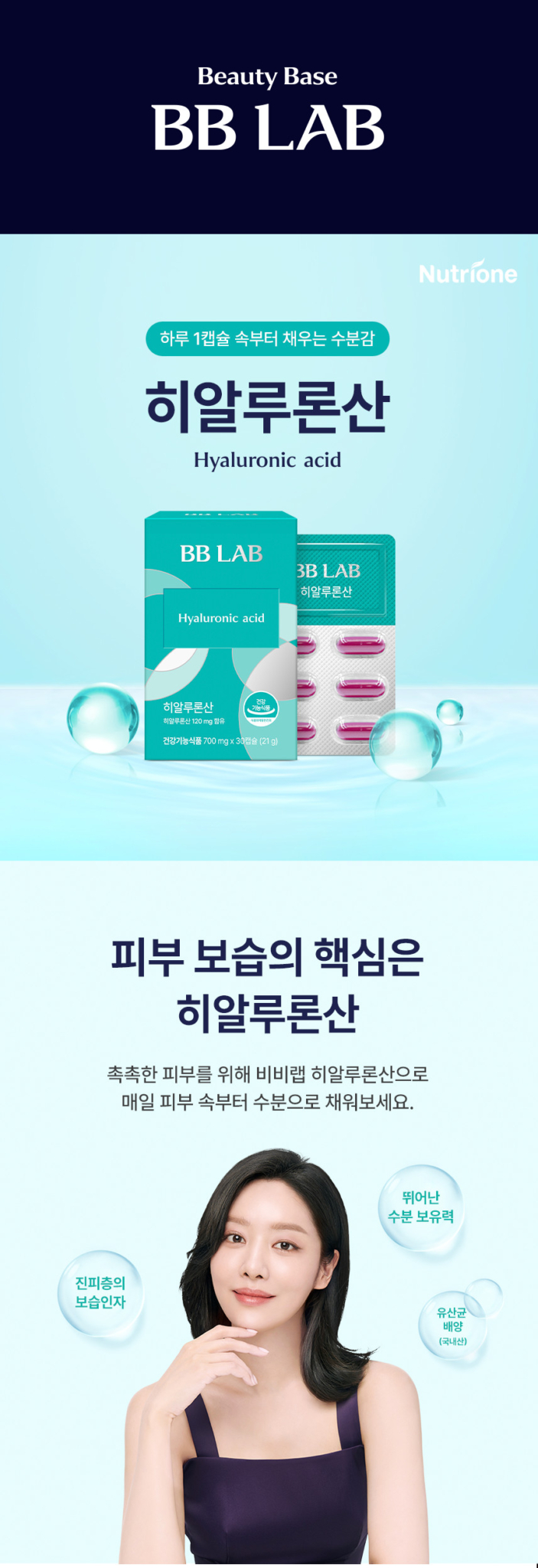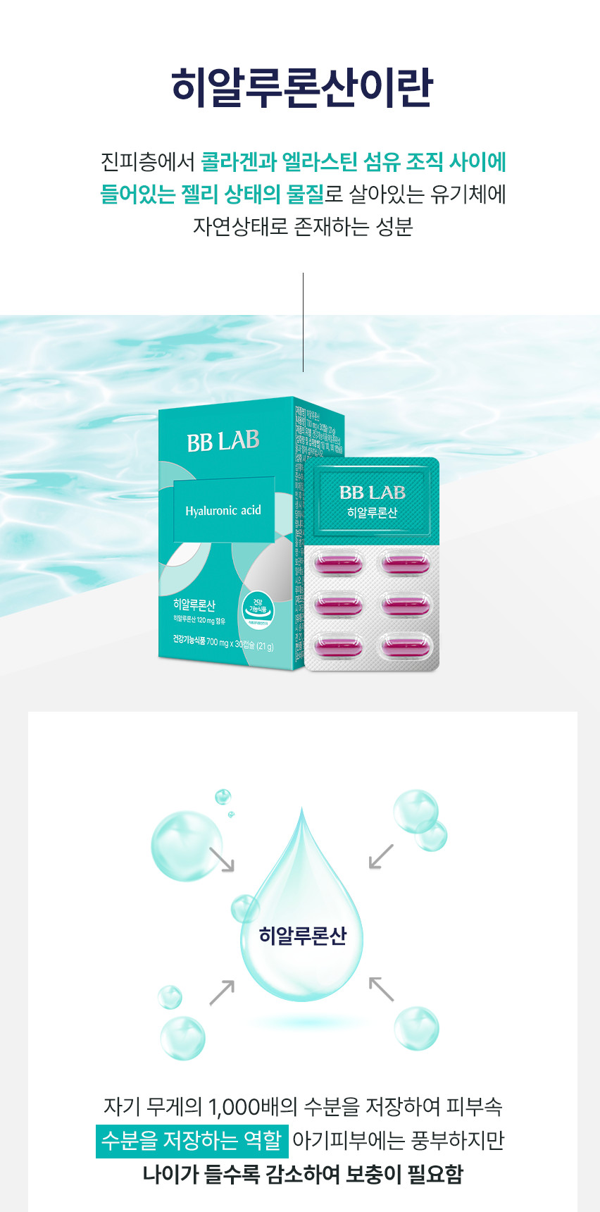 BB LAB Hyaluronic Acid capsules deliver 120mg of hyaluronic acid per serving for inner beauty hydration. These health functional food capsules support skin moisture from within, helping maintain a plump, hydrated complexion.