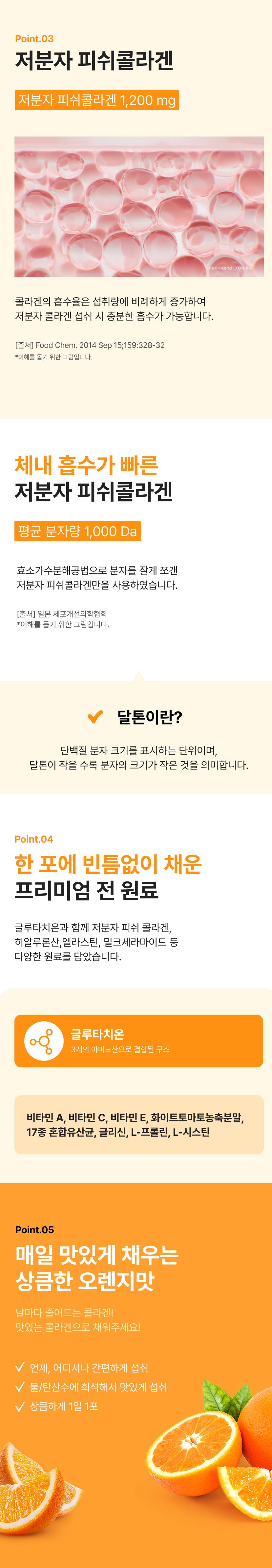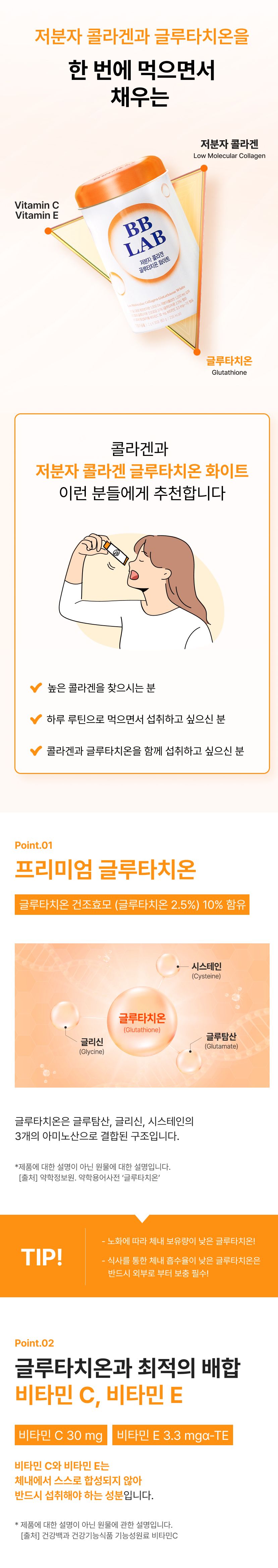 Premium beauty supplement from Korea featuring low molecular fish collagen peptide (1,200mg) and glutathione yeast 10% for skin brightening and elasticity support.