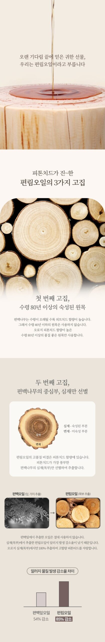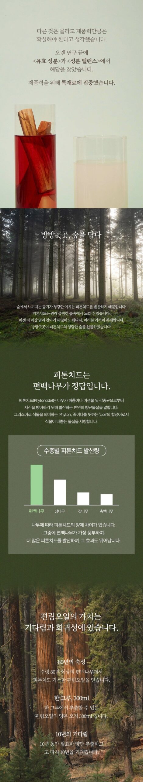 Why Phytoncide from Cypress Trees? Phytoncide is a natural antibacterial substance abundant in cypress trees, offering excellent effects. The oil is obtained from cypress trees over 80 years old, with only 300ml of phytoncide oil extractable per tree. Extracted using a decompression method, it retains the phytoncide’s natural properties and fragrance.