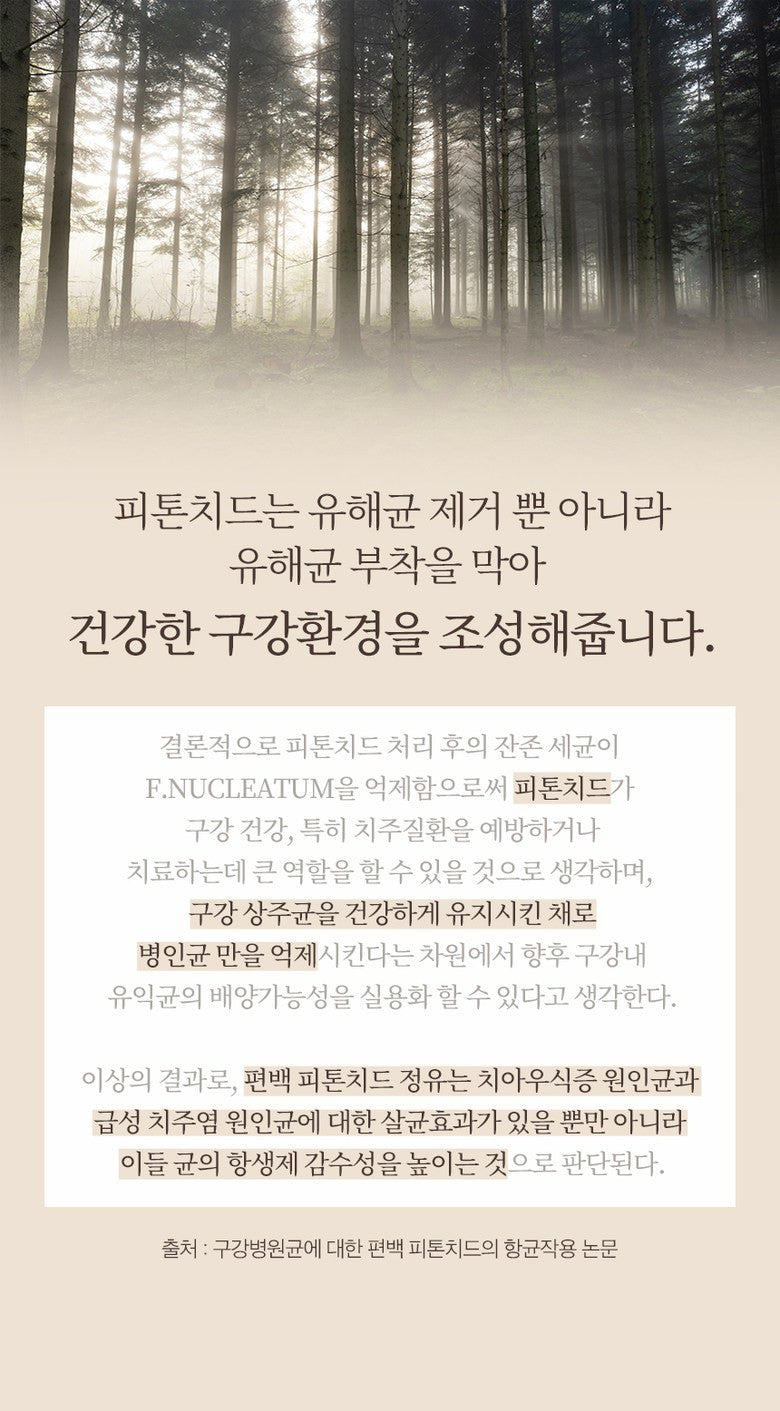- Healthy Oral Environment: Phytoncide removes harmful bacteria and prevents their attachment, maintaining healthy oral flora while suppressing pathogenic bacteria.