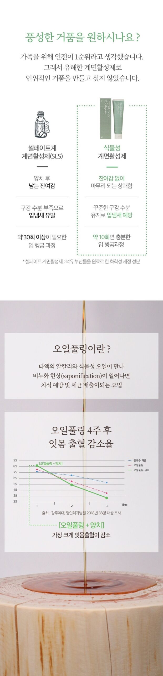 What is Oil Pulling? Oil pulling is the process where the alkaline of saliva and vegetable oil meet and saponify, preventing tartar and removing bacteria. Phyenlimcide in the toothpaste enhances the effectiveness of oil pulling, reducing gum bleeding after 4 weeks.