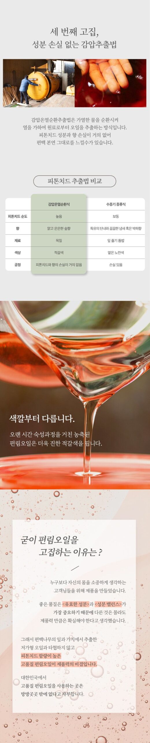 Why Phytoncide from Cypress Trees? Phytoncide is a natural antibacterial substance abundant in cypress trees, offering excellent effects. The oil is obtained from cypress trees over 80 years old, with only 300ml of phytoncide oil extractable per tree. Extracted using a decompression method, it retains the phytoncide’s natural properties and fragrance.
