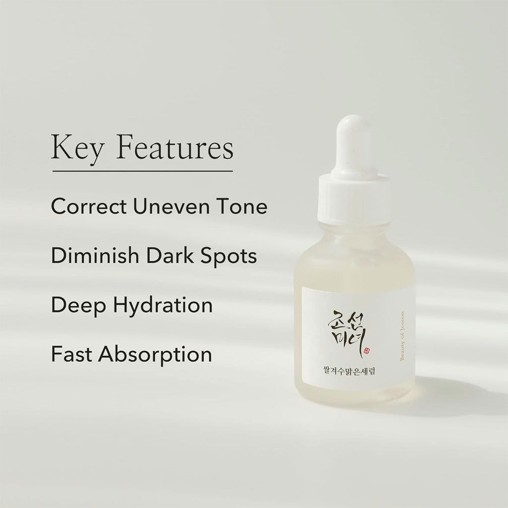 The Beauty of Joseon (BOJ) Glow Deep Serum: Rice + Arbutin is a lightweight, hydrating serum enriched with natural hanbang (traditional Korean herbal medicine) ingredients for brightening skin and fighting pigmentation. Formulated with 68% Rice Bran Water, which is rich in amino acids and minerals and has been used for centuries in Asian skincare remedies as it brightens skin and combats dullness, while 2% Arbutin protects skin from hyperpigmentation by inhibiting the formation of melanin.