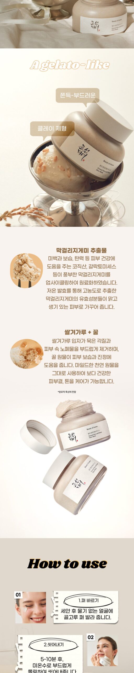 This versatile mask delivers a multitude of skin benefits, combining brightening, antioxidant, moisturizing, elasticity-boosting, scrubbing, and soothing (cooling) effects. The synergy of upcycled makgeolli lees, honey, clay powder, and rice hull powder ensures thorough skin care in one simple step.