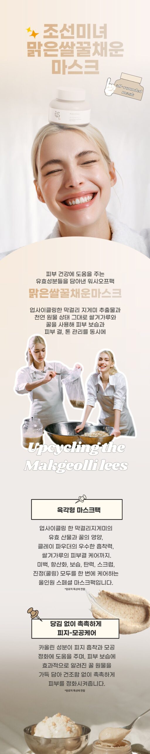 This versatile mask delivers a multitude of skin benefits, combining brightening, antioxidant, moisturizing, elasticity-boosting, scrubbing, and soothing (cooling) effects. The synergy of upcycled makgeolli lees, honey, clay powder, and rice hull powder ensures thorough skin care in one simple step.