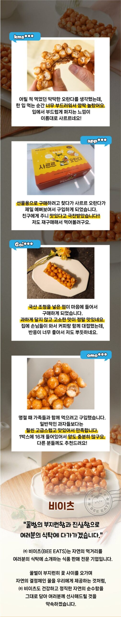 Hey there! So, I just tried the BEE EATS Oranda Healthy Snack and wow, what a treat! It’s got this light sweetness from the grain syrup that is super delightful. The way you can pop it in the microwave for a quick warm-up makes it perfect for those late-night cravings. And if you’re into crispy snacks, try refrigerating ’em—seriously good vibes with an Americano or even some matcha latte. Also loving how it’s all about that authentic rice vinegar flavor—it really takes me back to family get-togethers when my grandma used to whip up treats like this. Perfect snack option for anyone looking for something yummy yet healthy!