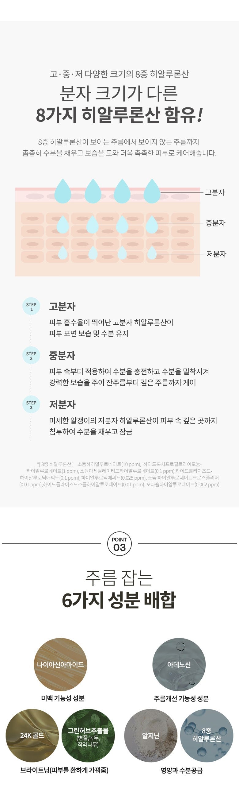 - Medium Molecular Weight: Recharges moisture, boosts skin adhesion, and smooths fine to deep wrinkles.