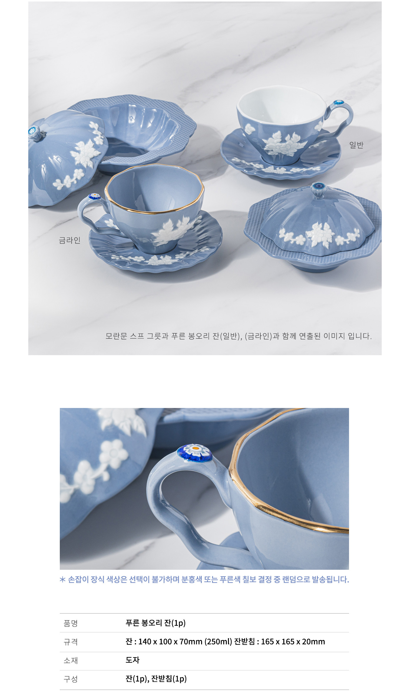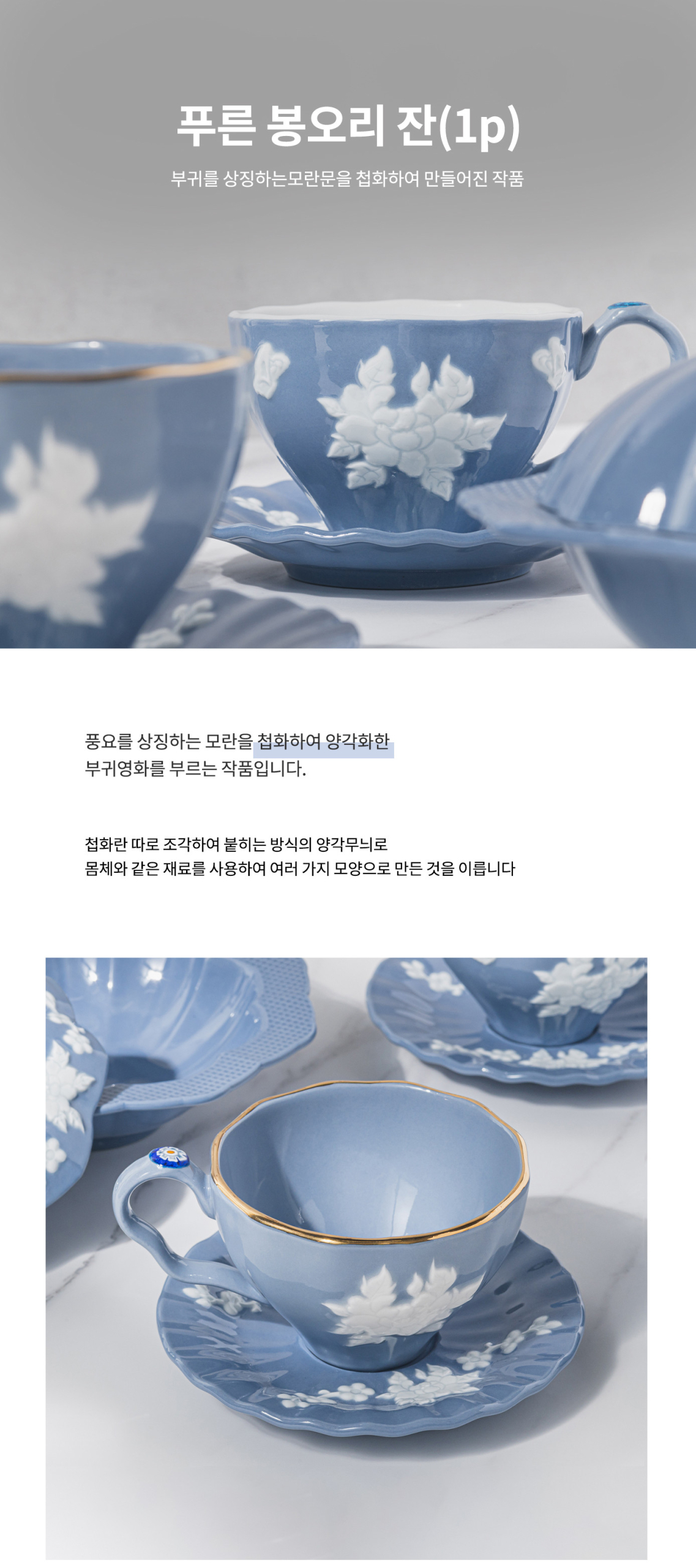 This exquisite teacup and saucer set (푸른 봉오리 잔) captures the delicate beauty of spring blossoms in elegant Korean porcelain. The soft sky-blue glaze paired with white floral relief creates a serene, sophisticated aesthetic perfect for special tea moments.