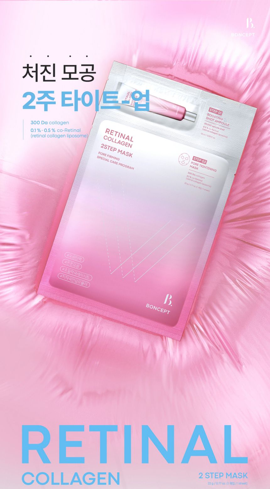 A premium Korean two-step mask sheet that combines retinal and collagen for intensive pore tightening and skin firming.