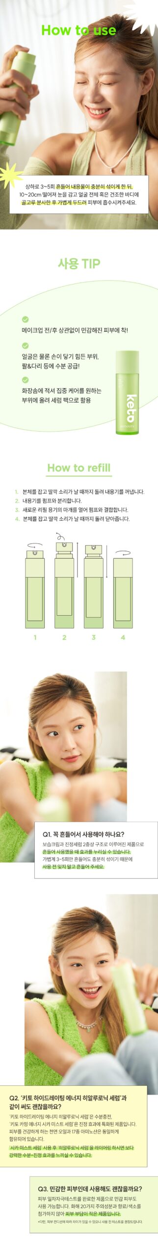 Shake up and down 3 to 5 times to mix the contents sufficiently, then close your eyes from a distance of 10 to 20 cm and spray evenly on the entire face or dry body, then pat lightly to absorb into the skin.
