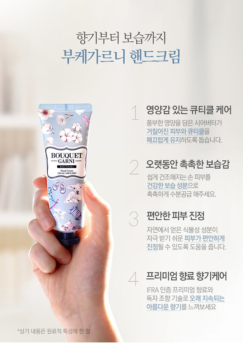 I’ve been using the Bouquet Garni Hand Cream with Baby Powder scent for a few weeks now, and I’m really impressed. The creamy texture absorbs quickly without feeling greasy, which is perfect for my busy lifestyle. It has an amazing long-lasting moist feeling that keeps my hands hydrated throughout the day. I also appreciate the premium fragrance; it adds a lovely touch without being overwhelming. The cuticle care aspect works wonders—my fingertips have never looked better! Highly recommend this hand cream if you’re looking for something nourishing.