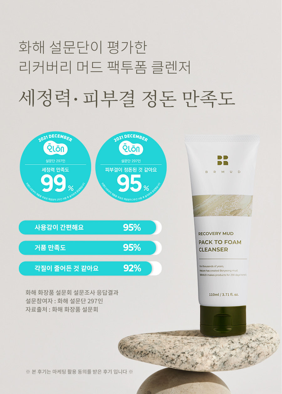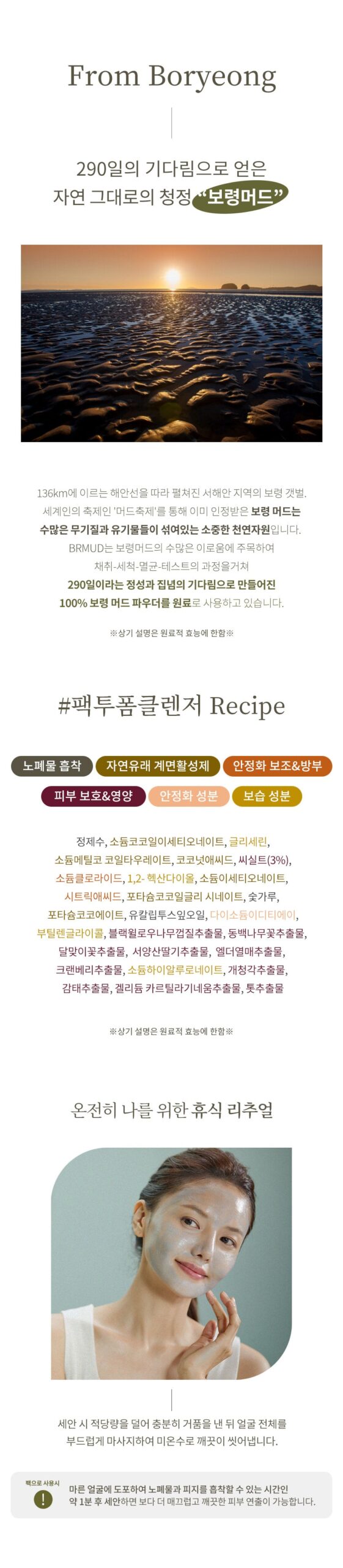 Boryeong tidal flats in the west coast area stretch along the 136 km coastline. Boryeong Mud, which has already been recognized through the ‘Mud Festival’, a global festival, is a precious natural resource that contains numerous minerals and organic substances. BRMUD pays attention to the many benefits of Boryeong Mud and uses 100% Boryeong Mud Powder as a raw material, which was made through the process of collecting, washing, sterilizing and testing, and waiting for 290 days with sincerity and tenacity.