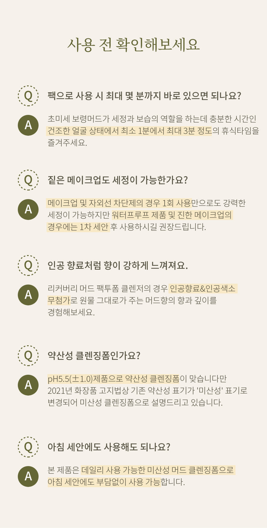 A. Please enjoy a break time of at least 1 minute to a maximum of 3 minutes on a dry face, which is enough time for the ultra-fine Boryeong Mud to clean and moisturize.