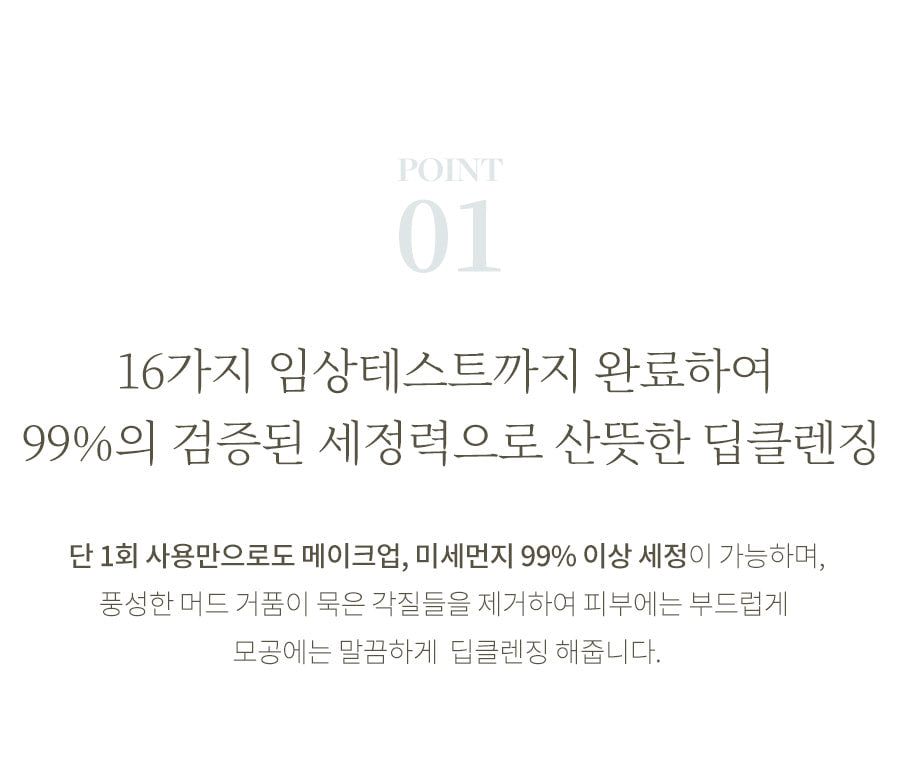 With just one use, more than 99% of makeup and fine dust can be cleansed, and the rich mud foam removes dead skin cells to provide deep cleansing that is gentle on the skin and cleans pores.