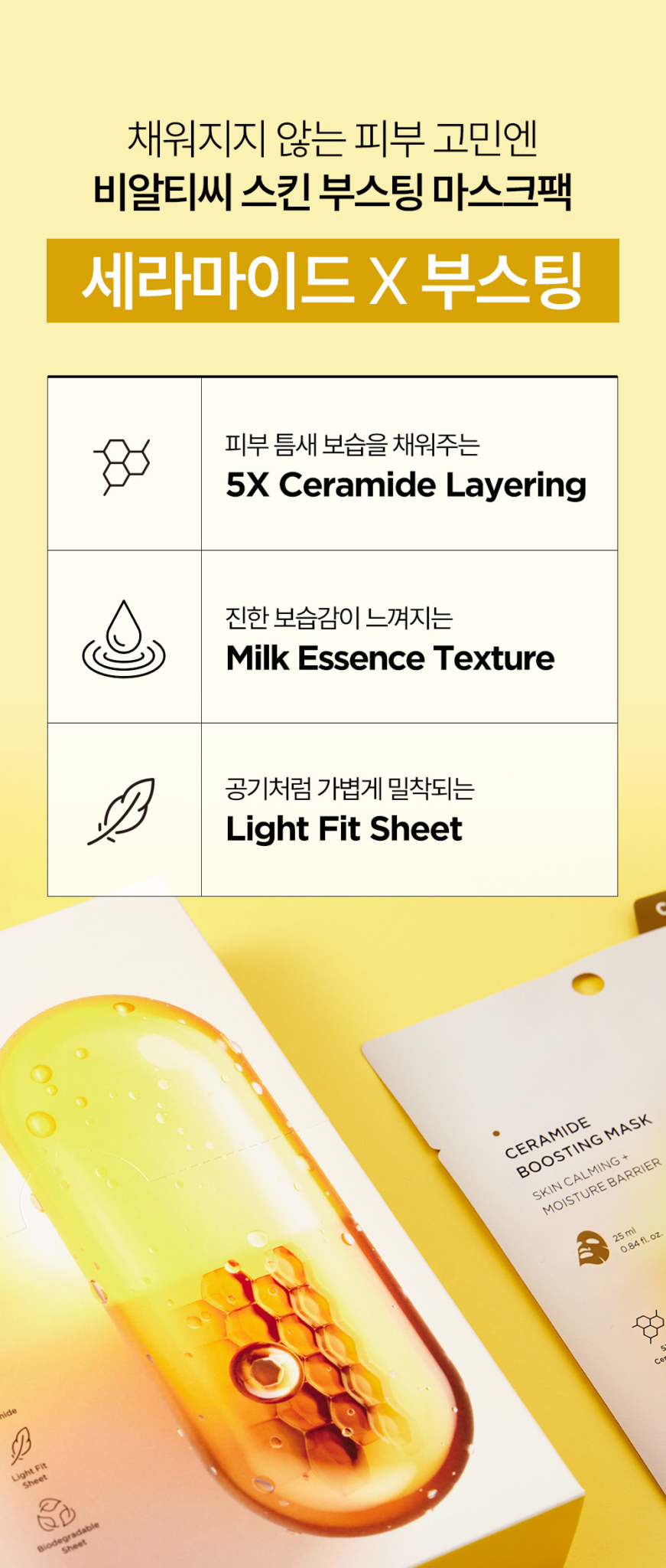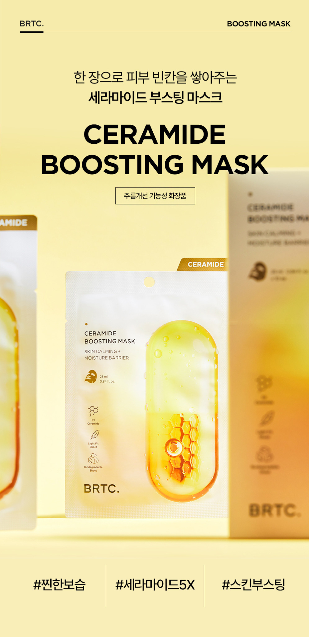 The BRTC Ceramide Boosting Mask is formulated with 5X Ceramide complex for intensive skin calming and moisture barrier restoration. This 10-sheet pack in warm yellow and honey-toned capsule packaging delivers deep hydration while strengthening the skin’s protective barrier for lasting comfort.