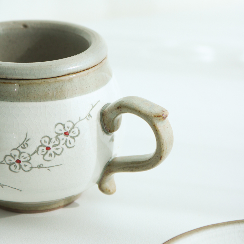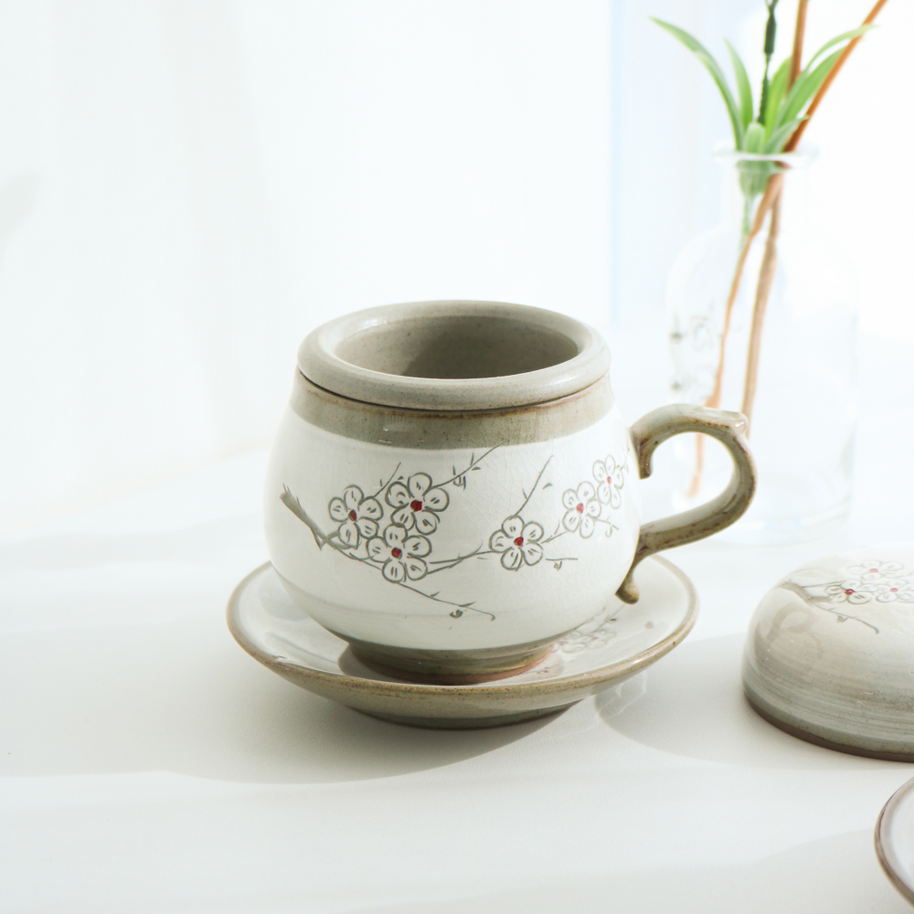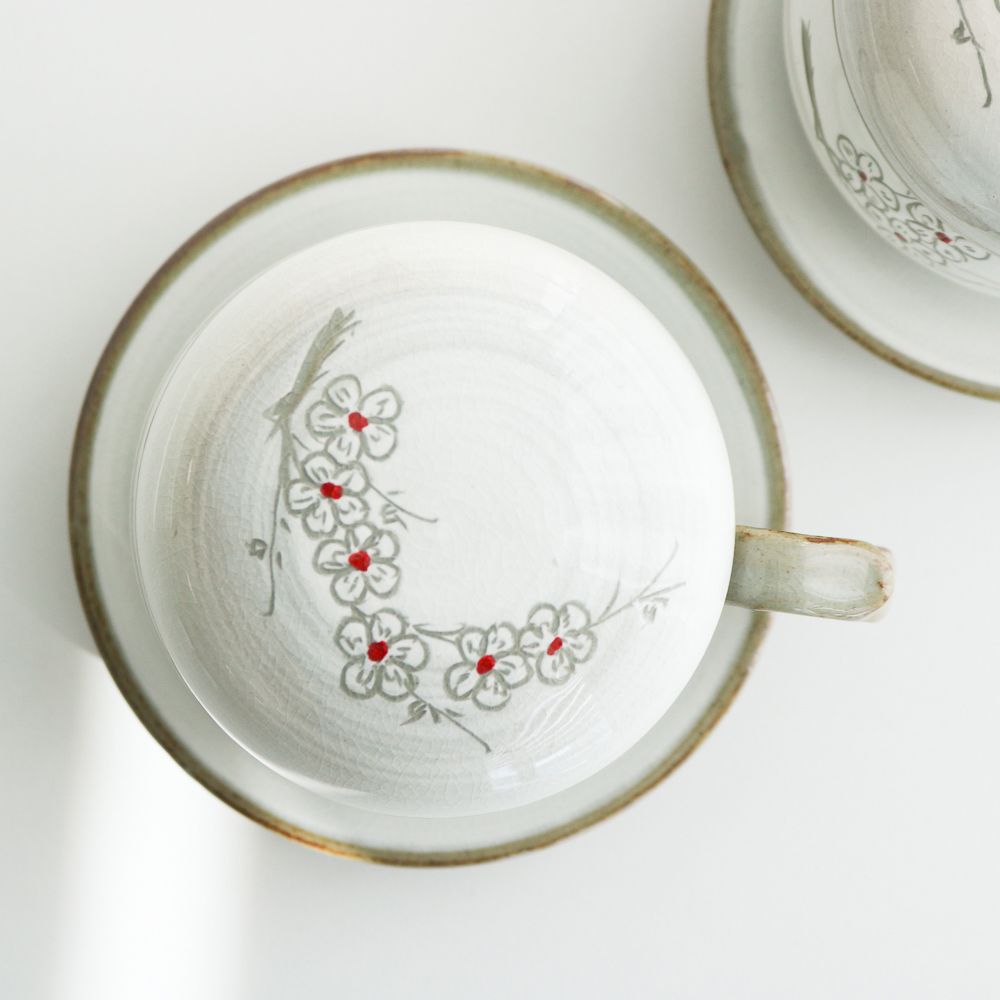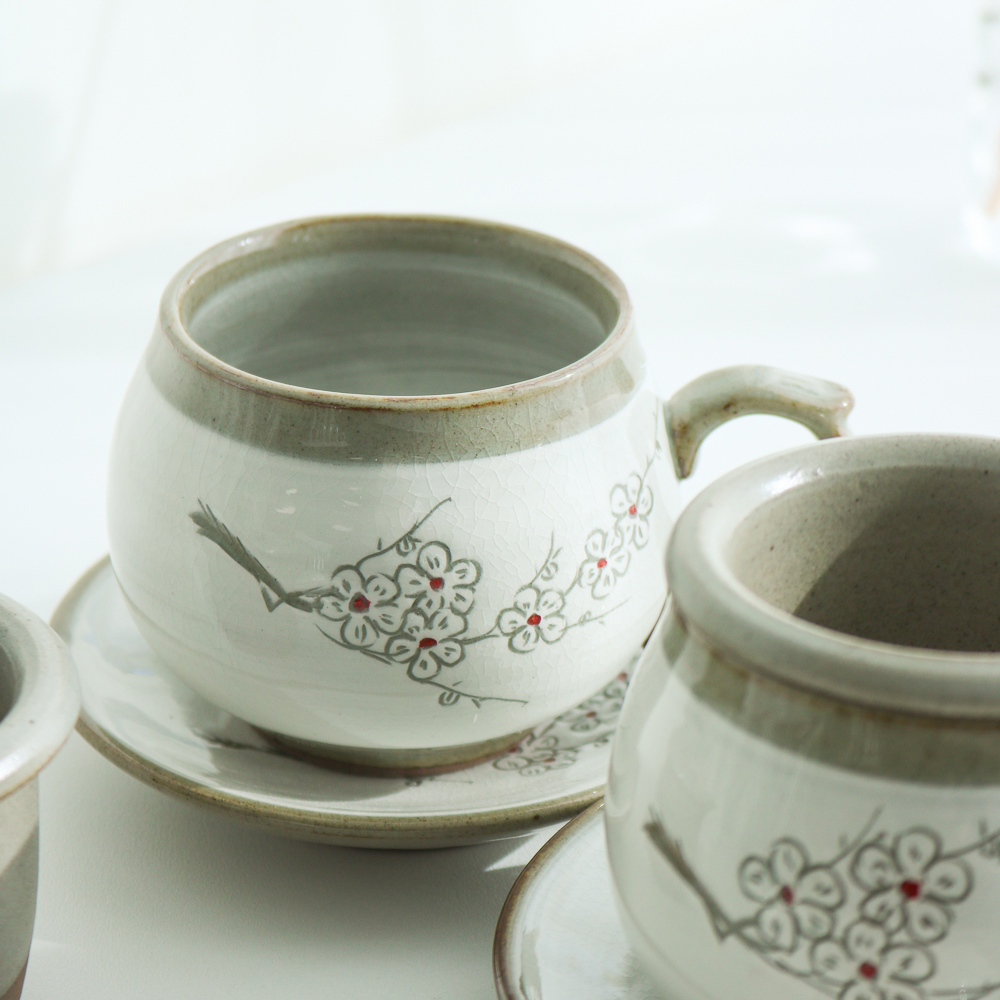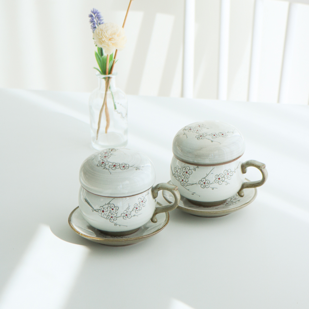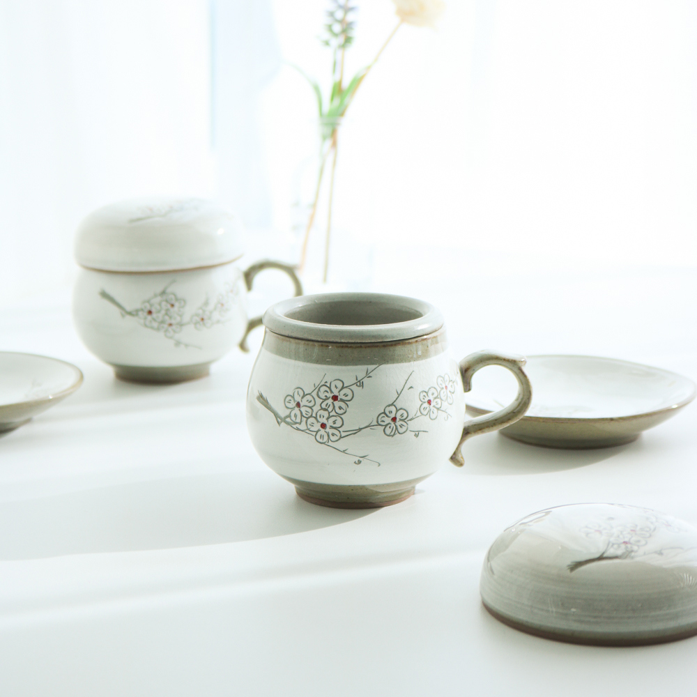 Buncheong White Inlay Plum Blossom Tea Cup Set – Traditional Korean Ceramics