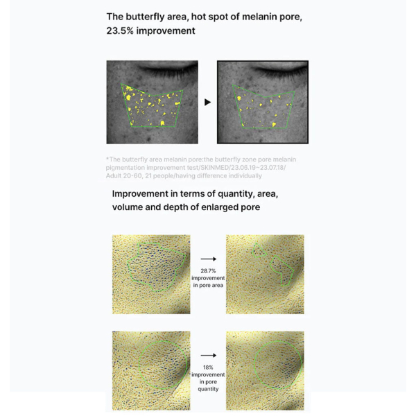 I noticed less dark spots and clearer areas after a few weeks. Absorbs fast without stickiness. Not sure about larger pores yet, but I think it helps overall appearance.