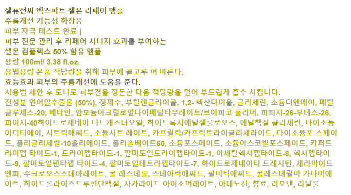 Start with a cleansed and toned face. Apply an appropriate amount of the Salmon Repair Ampoule and gently massage it into the skin for full absorption.