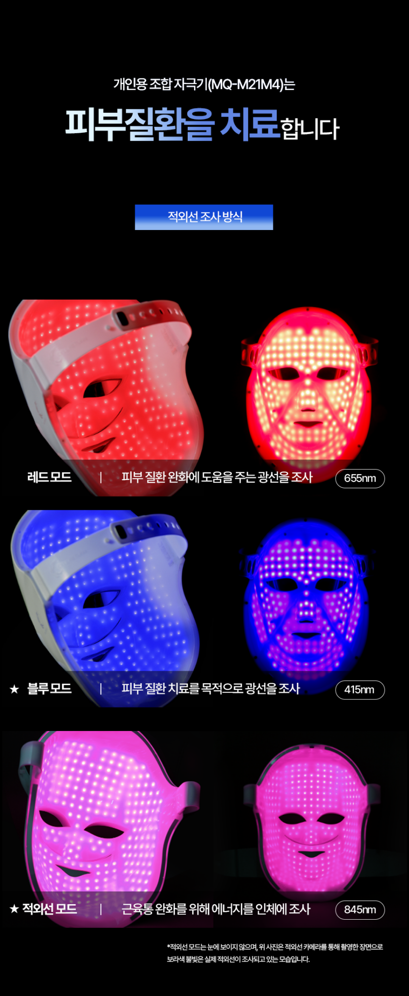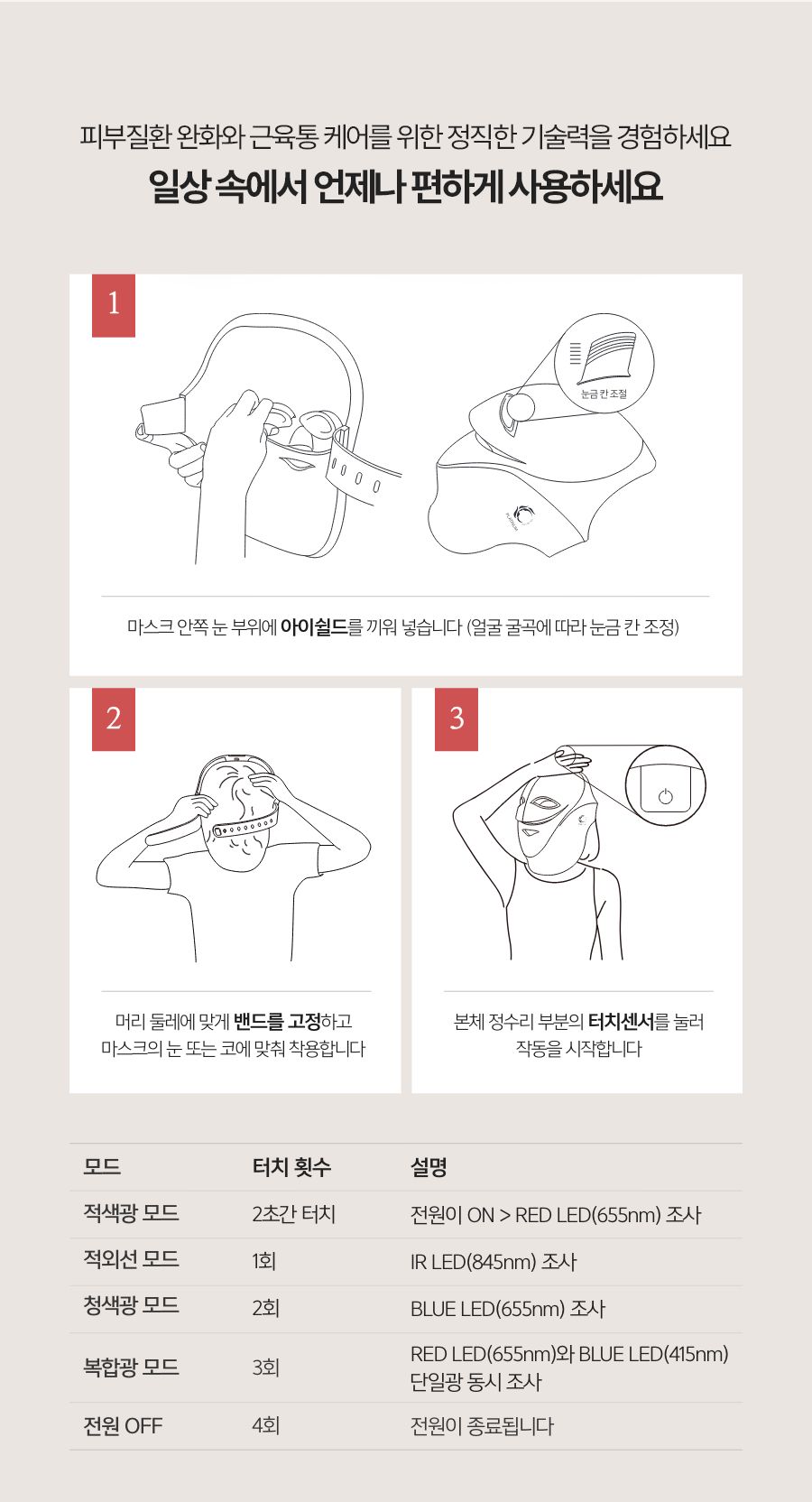 - Pink Mode (20 min): Red + Blue for inflammation reduction, skin calming