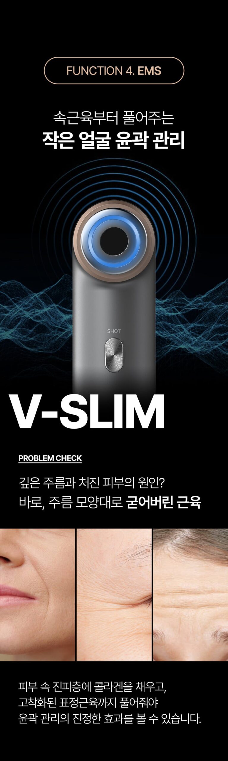 - V-SLIM: Releases hardened muscles deep within the skin using mid-low frequency EMS, sculpting and contouring your face.