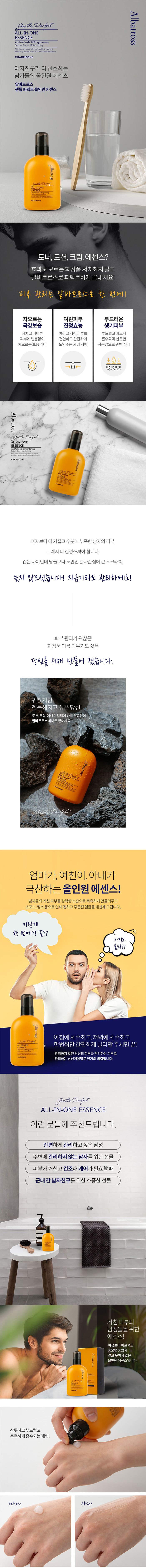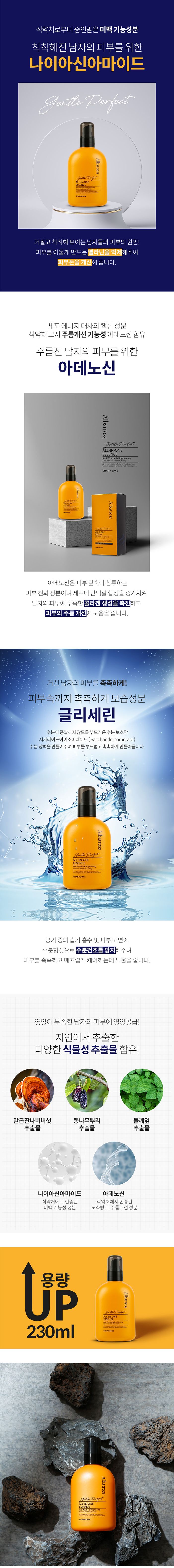Charmzone Albatross Gentle Perfect Men All-in-One Essence is a comprehensive skincare solution designed specifically for men’s skin. This all-in-one essence combines the functions of toner, lotion, essence, and cream in a single product, making it perfect for busy men who want effective skincare without a complicated routine. From Korea’s trusted Charmzone brand (established 1984), this generous 230ml formula provides long-lasting hydration and skin conditioning.