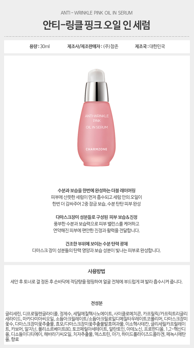 Charmzone Anti-Wrinkle Pink Oil In Serum is a lightweight yet powerful anti-aging serum that combines the benefits of oil and serum in one innovative formula. This KFDA-certified functional cosmetic specifically targets wrinkles while delivering deep hydration and nourishment. The unique oil-in-serum texture absorbs quickly without greasy residue, making it perfect for daily use.