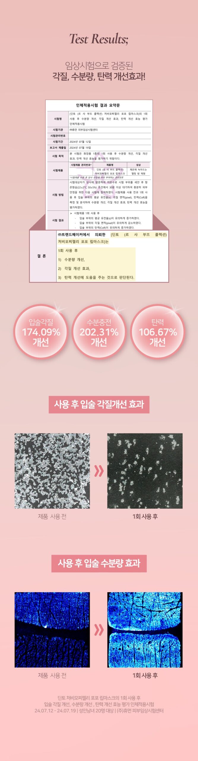 - Texture & Elasticity Improvement: 100% noted smoother, more supple lips.