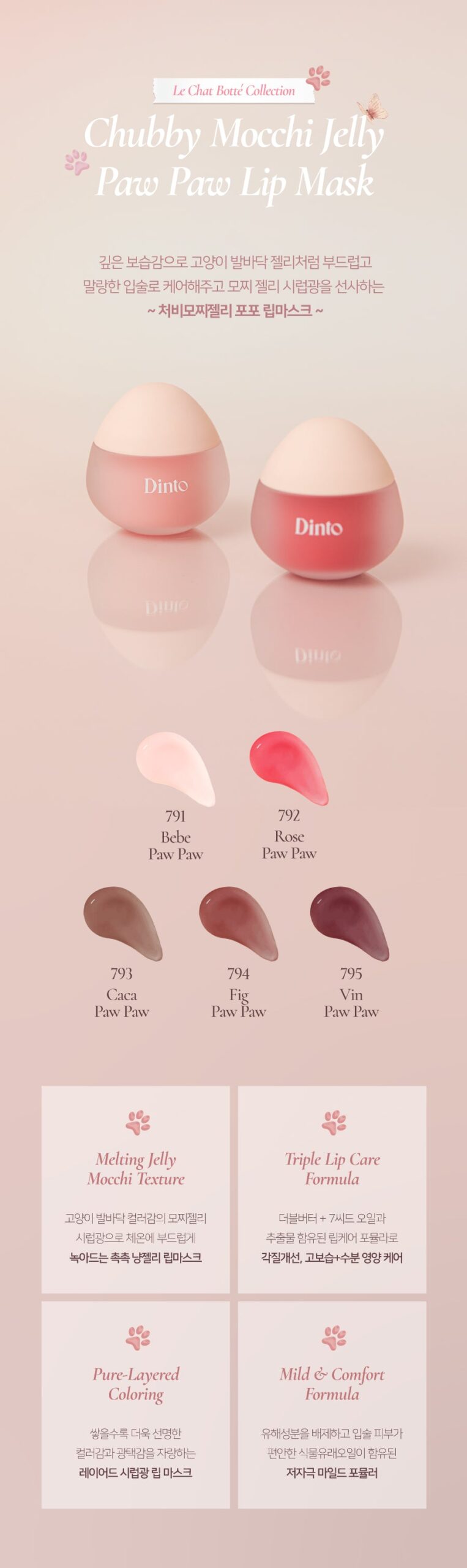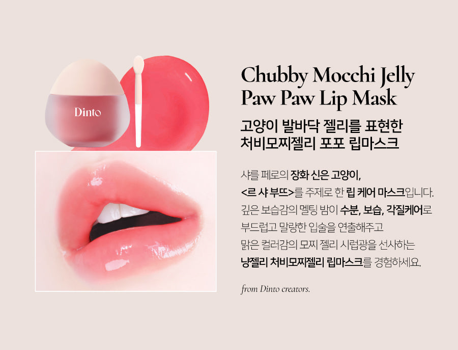 Indulge in the Chubby Mocchi Jelly Paw Paw Lip Mask, inspired by the adorable jelly paws of cats, designed for luxuriously soft, supple lips with a glossy, syrup-like shine. Part of the Le Chat Botté collection, inspired by the classic French fairy tale Puss in Boots, this lip mask brings enchanting care and color to your lips.