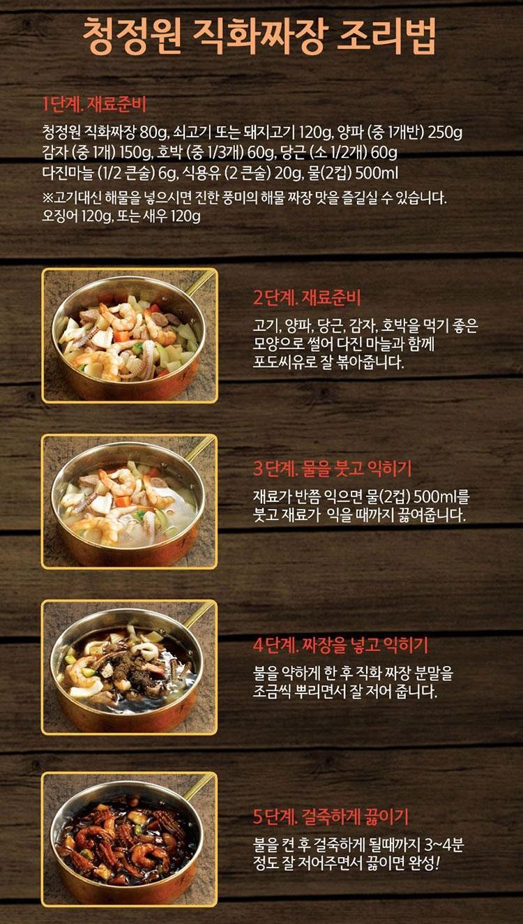 - Required: 80g Chungjungwon direct-fired black bean paste, 120g beef or pork, 250g onion, 150g potato, 80g pumpkin, 60g carrots, 6g minced garlic, 20g cooking oil, 500ml water.