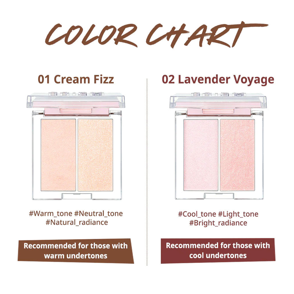 | Shade Options | 01 Cream Fizz (Warm/Neutral), 02 Lavender Voyage (Cool/Light) 2.8g x 2 |
