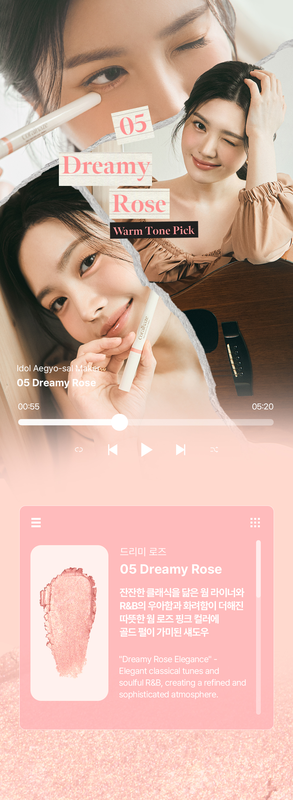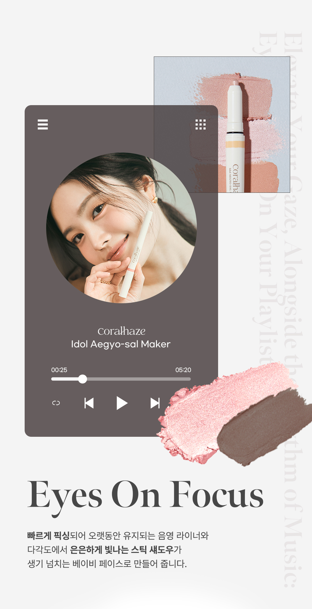 Create your own music playlist tailored to the swaying mood of spring. Discover unique tailor-made colors that reflect your individual mood, completing a distinctive atmosphere. With Coralhaze, your eyes become the main act, shining with a subtle glow that lasts all day.