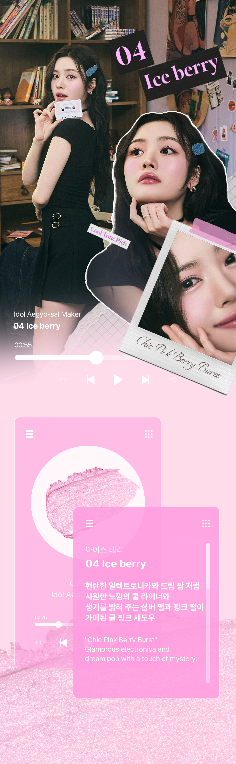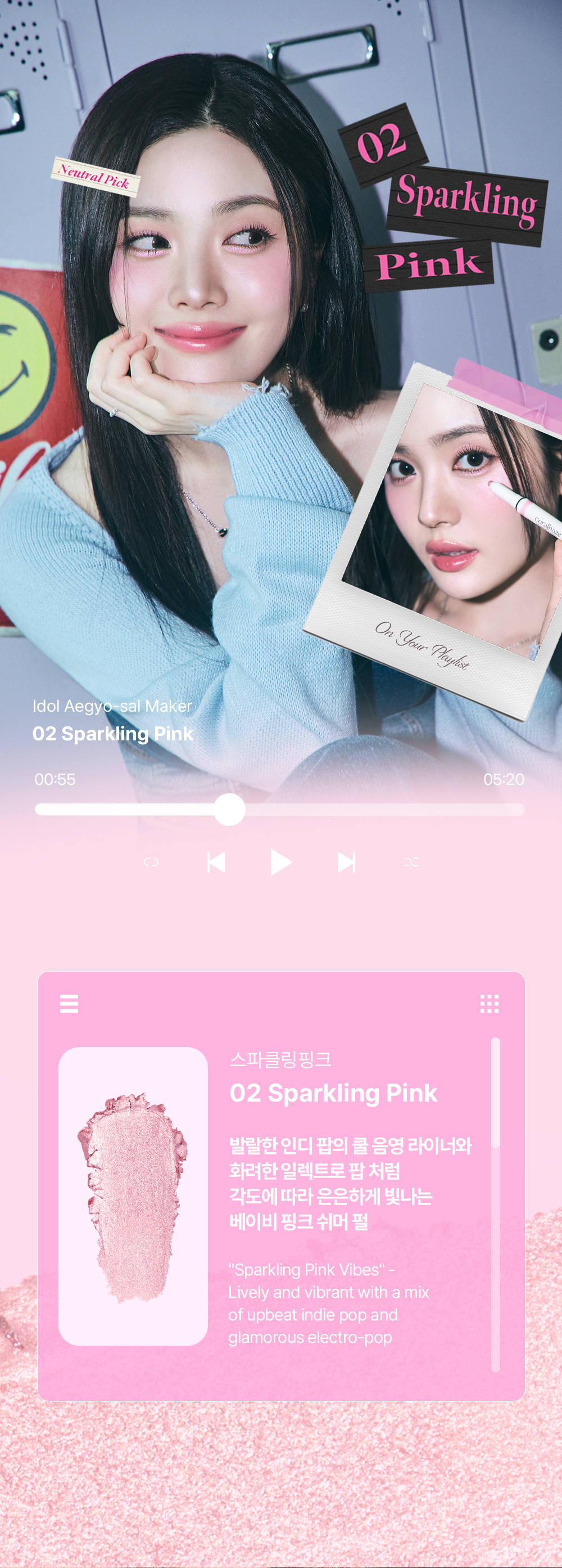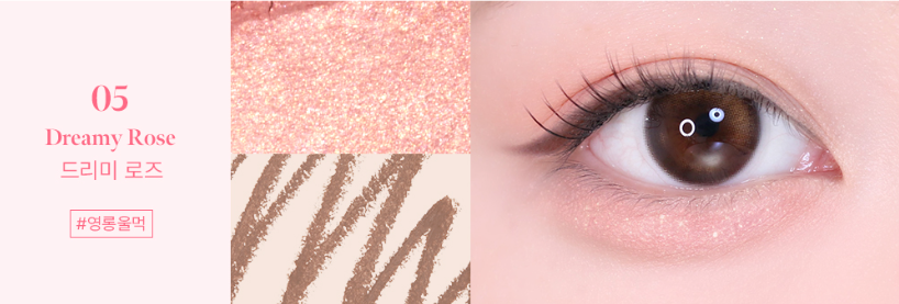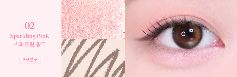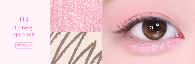 This shade features a bright, indie-pop cool-toned shadow liner and a baby pink shimmer pearl stick shadow that subtly shines from every angle, reflecting a cheerful and energetic mood. Perfect for a fresh and playful K-pop idol makeup look.
