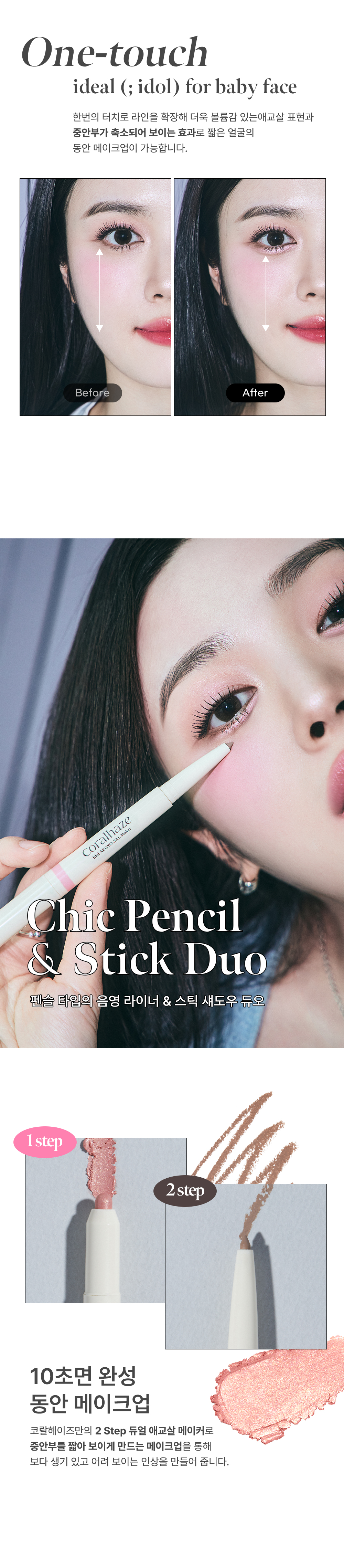 With Coralhaze’s unique 2-step aegyo sal maker, you can easily create makeup that makes the area under your eyes appear plumper, resulting in a more lively and youthful look in just moments.