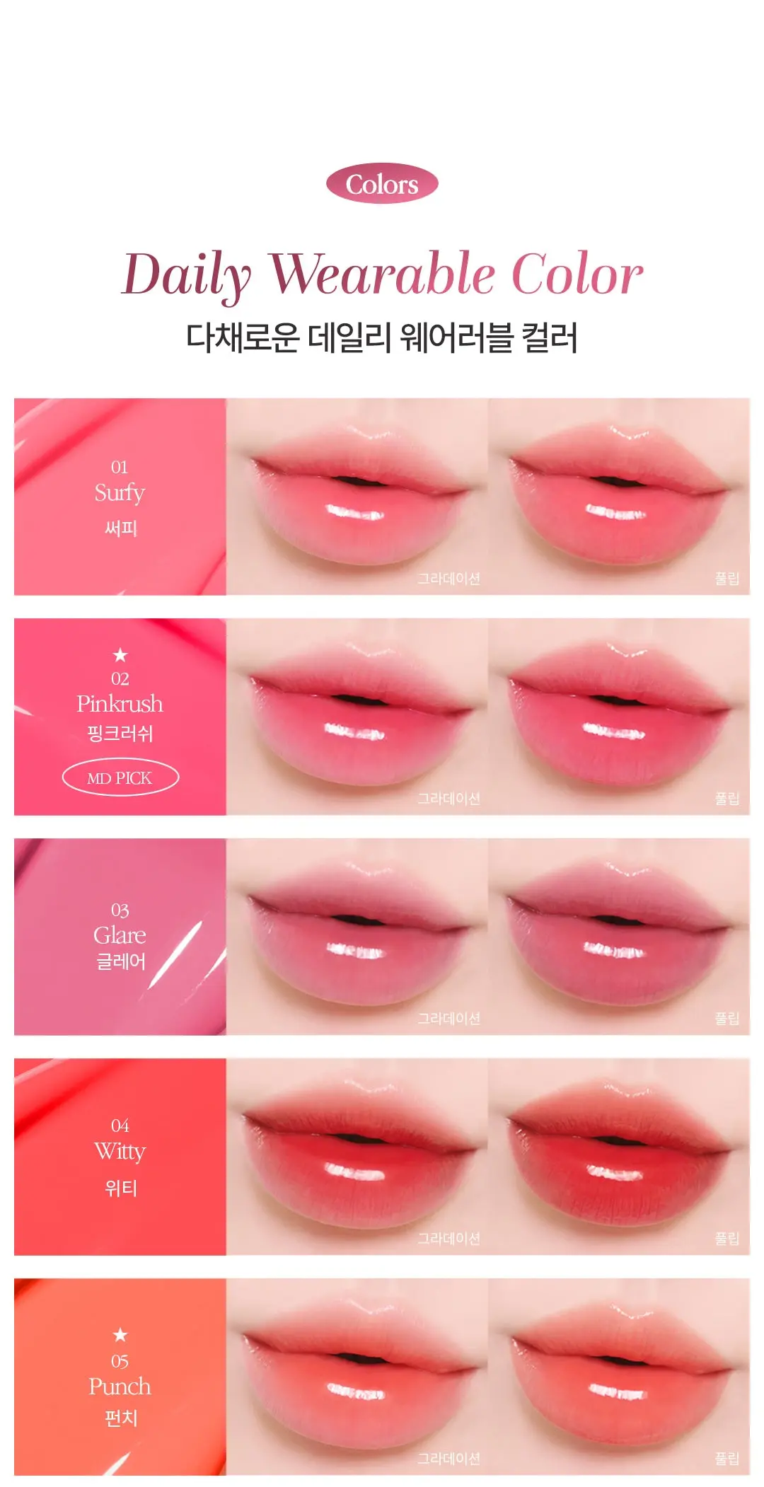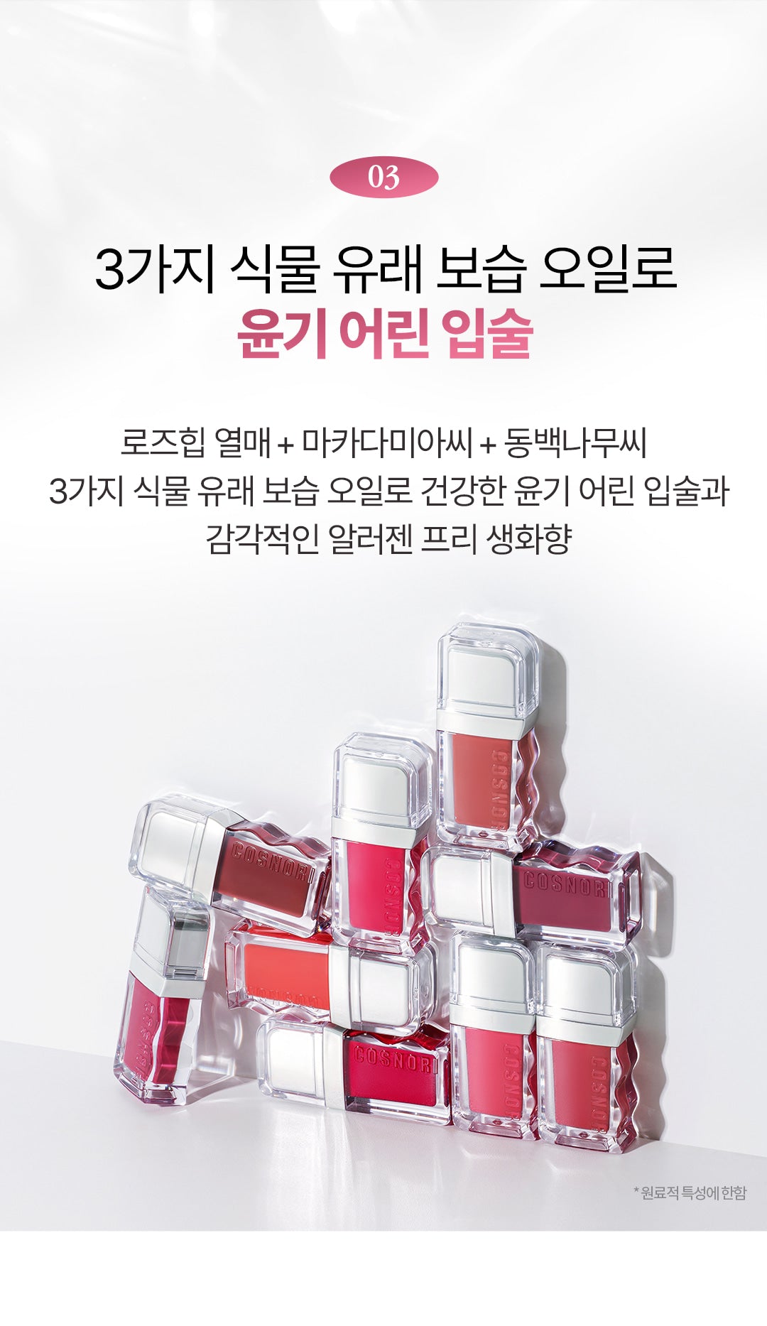 Experience the ultimate lip tint with COSNORI Wave Tint, a product designed to deliver a lightweight yet voluminous glow. Its unique texture provides a triple glass-like shine that becomes more transparent and glossy with each application.