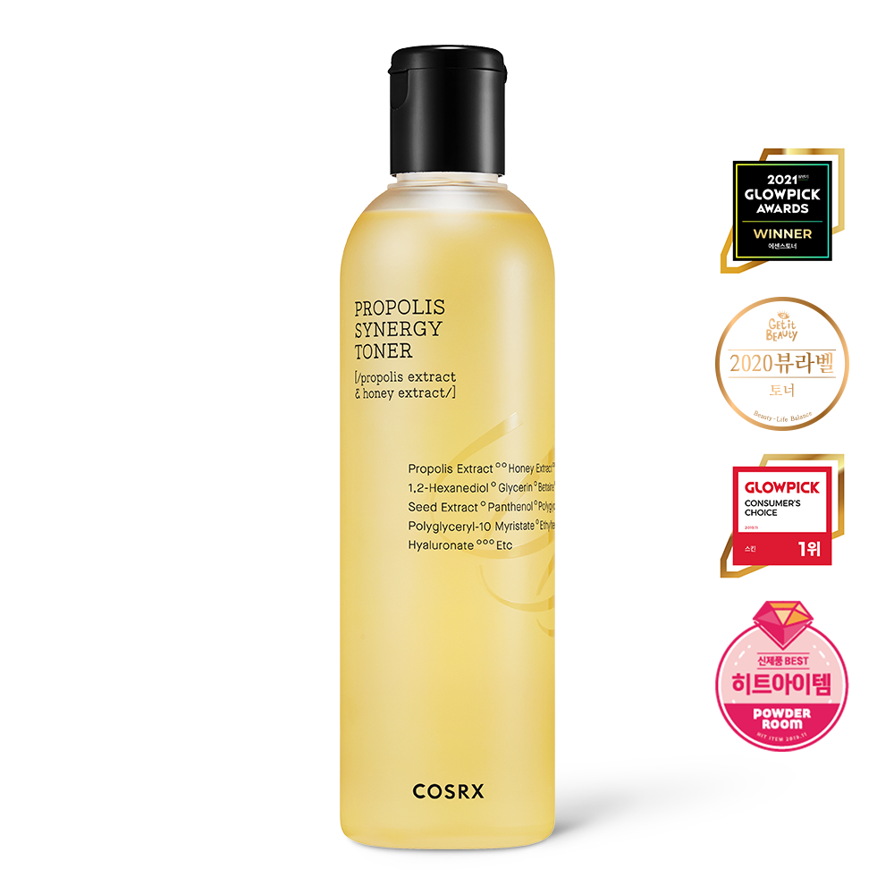 Formulated with 72.6% Black Bee Propolis extract, Cosrx’s Full Fit Propolis Synergy Toner is a lightweight but nutrient-dense toner that helps nourish, repair and revive dull, lackluster skin. Its viscous, essence-like consistency quickly absorbs and delivers a high concentration of antibacterial and antioxidant benefits. Skin appears smoother, more radiant and glowing.