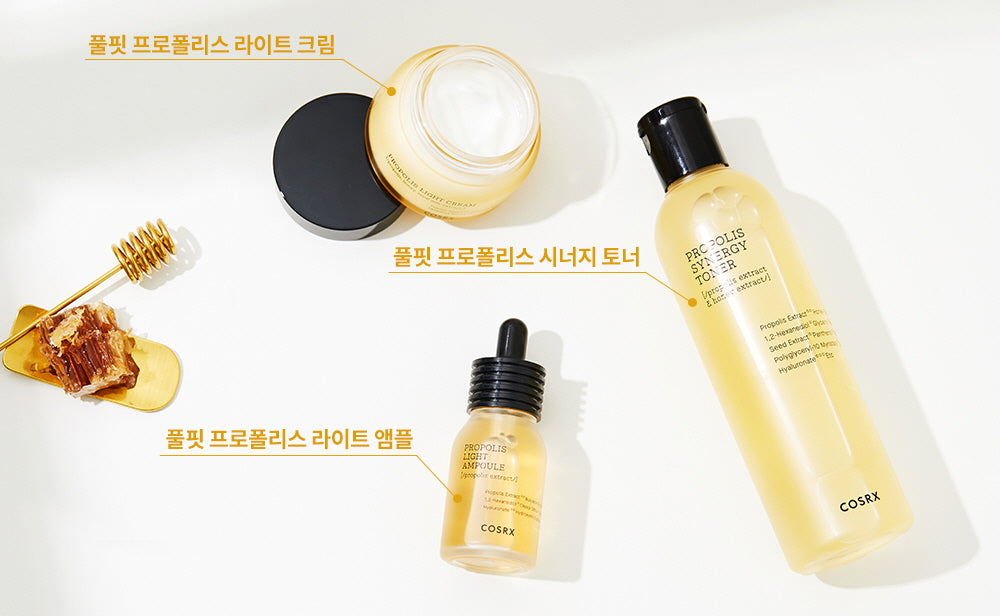 - Propolis Extract, Honey Extract, Butylene Glycol, 1,2-Hexanediol, Glycerin, Betaine, Cassia Obtusifolia Seed Extract, Panthenol, Polyglyceryl-10 Laurate, Polyglyceryl-10 Myristate, Ethylhexylglycerin, Sodium Hyaluronate, Hydroxyethyl Acrylate/Sodium Acryloyldimethyl Taurate Copolymer, Caprylic/Capric Triglyceride
