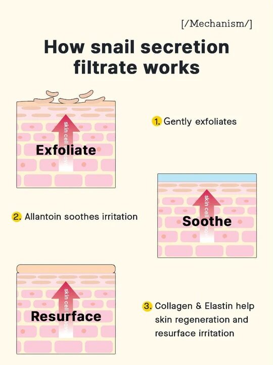 - 92% Snail Mucin: A high concentration of snail mucin supports skin regeneration and builds a moisture barrier to hydrate and soothe the skin.