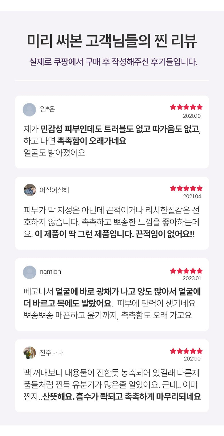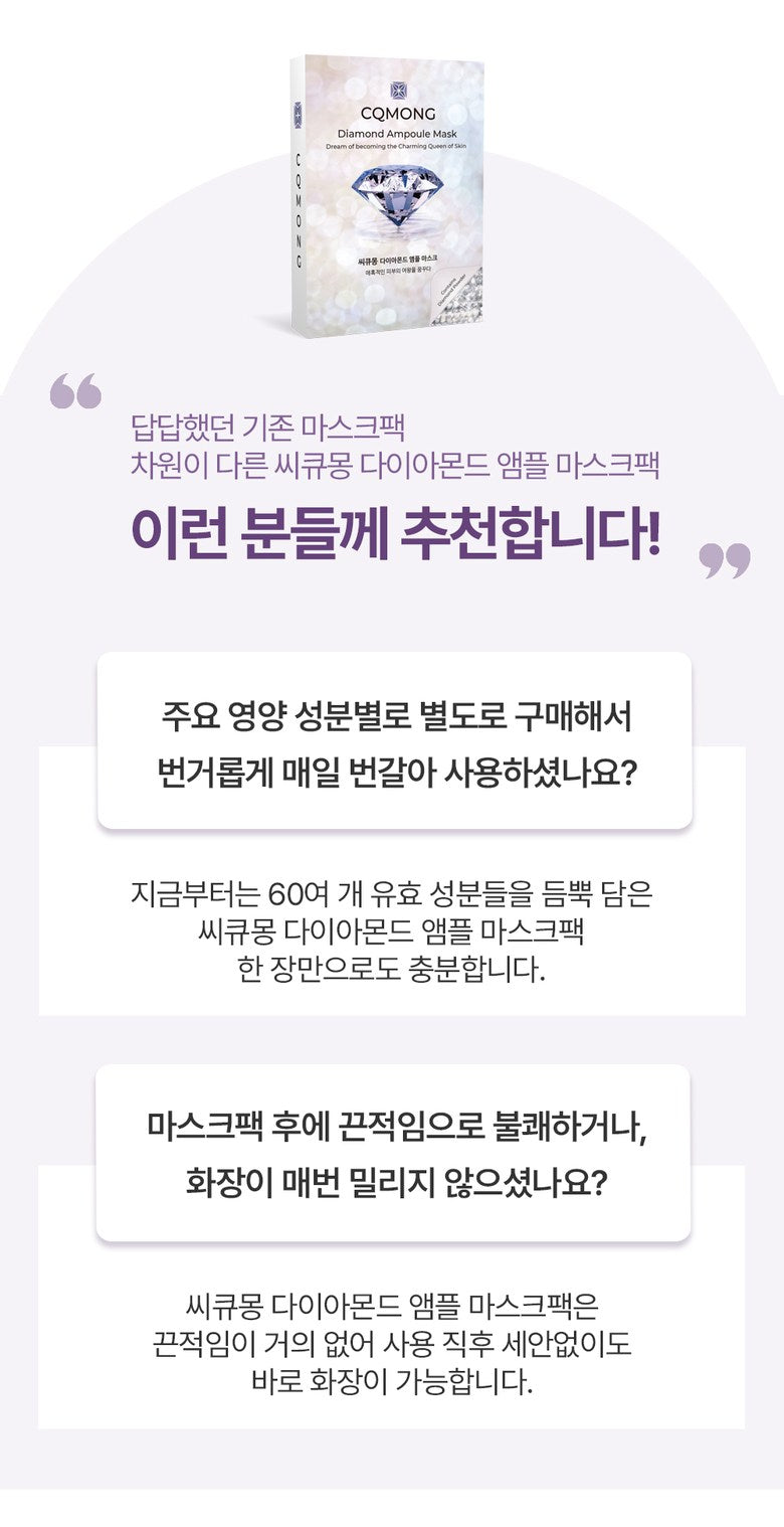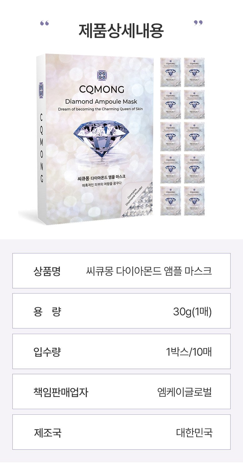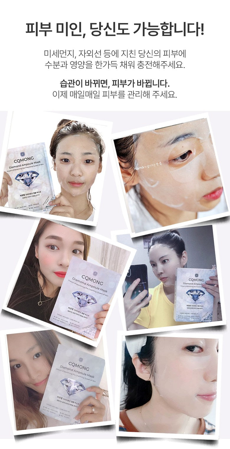 このCQMONGダイヤモンドアンプルマスクパックを試した結果、明らかな違いが感じられました。美容業界に数多のシートマスクがありますが、この製品は30gもあるリッチなエッセンスによって特別です。その使用後には、お肌がぷるんとした潤いで満ちあふれており、一層健康的に見えます。他ブランドではこれほどの成分量は望めません。まさに忙しい毎日にも最適!額から首元まで余ったエッセンスをつけても効果あり、隅々までケアできます。この美しさへの投資、不安無用!