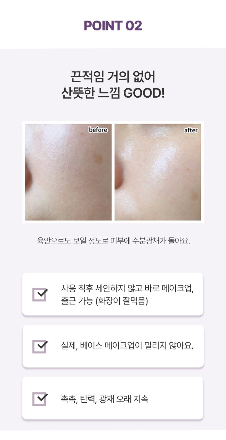 - Ideal for applying makeup afterward; the base makeup won’t smudge, and the effects of moisture, elasticity, and glow last for hours.