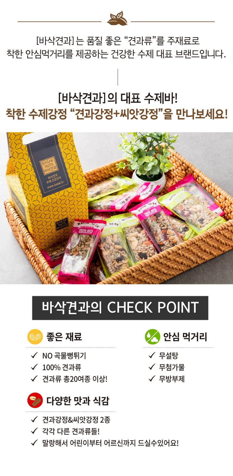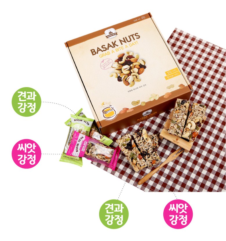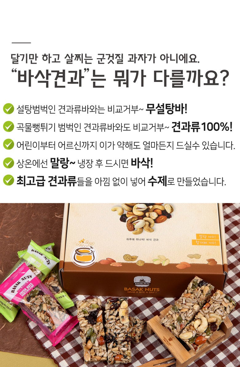 Embark on a journey to wellness with Basak Nuts, your go-to brand for delicious, handmade, healthy snacks. Our flagship products, the Nut Gangjeong and Seed Gangjeong bars, are crafted from a diverse selection of over 20 high-quality nuts, ensuring a nutritious snack for all ages.