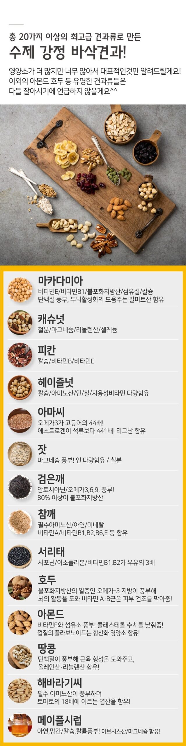 Nut Gangeong: Almonds, walnuts, roasted peanuts, pumpkin seeds, sunflower seeds, cranberries, cashews, raisins, dried bananas, oats, pecans, hazelnuts, macadamias, rice syrup, maple syrup.