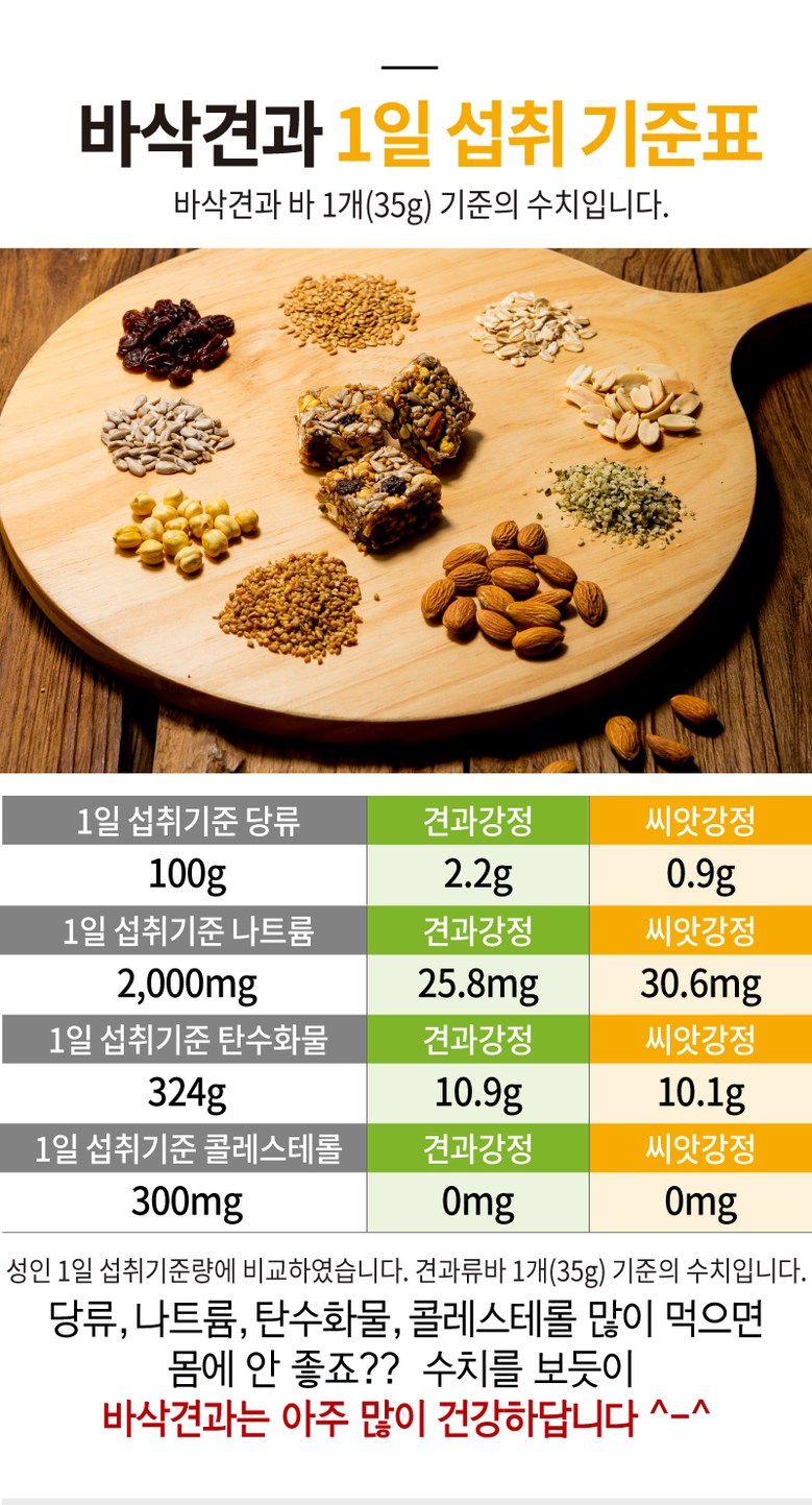 Seed Gangjeong: Calories 160kcal, carbohydrates 10.1g, sugars 0.9g, crude protein 5.1g, Crude fat 11.1g, trans fat 0g, saturated fat 1.6g, cholesterol 0g, sodium 30.6mg