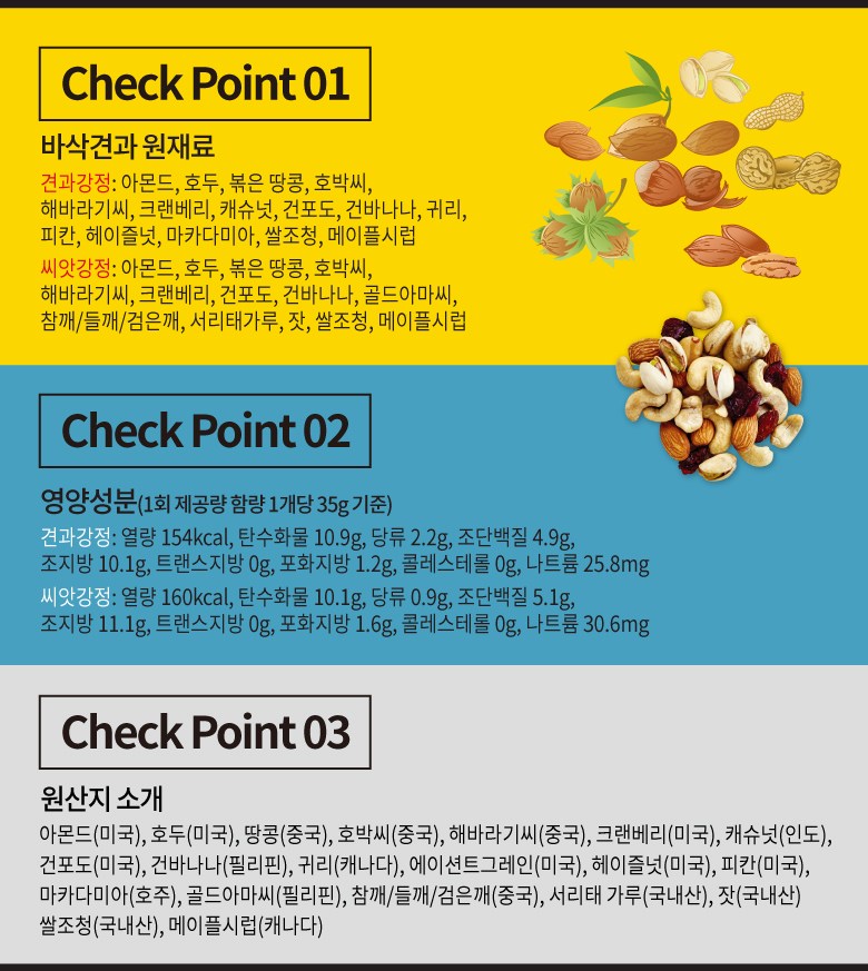 Seed Gangjeong: Almonds, walnuts, roasted peanuts, pumpkin seeds, sunflower seeds, cranberries, raisins, dried bananas, gold flaxseeds, sesame seeds/ perilla seeds/black sesame seeds, seaweed powder, pine nuts, rice syrup, maple syrup